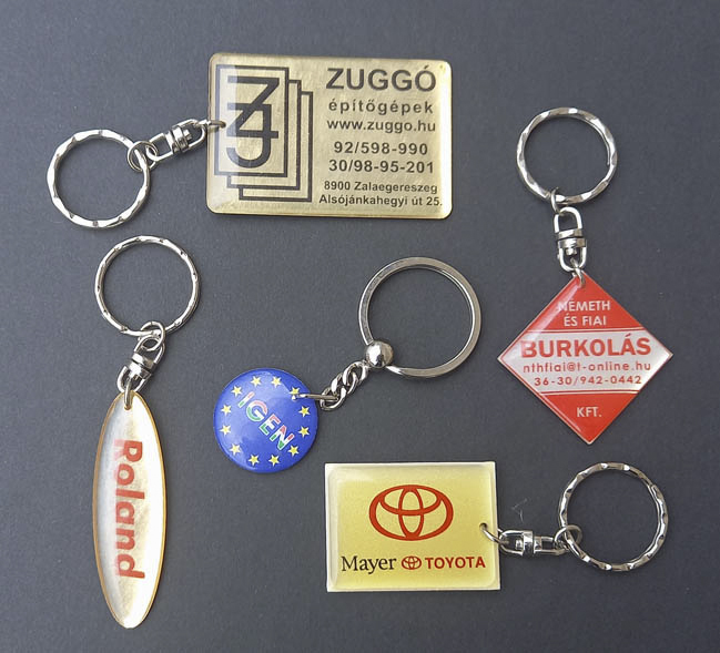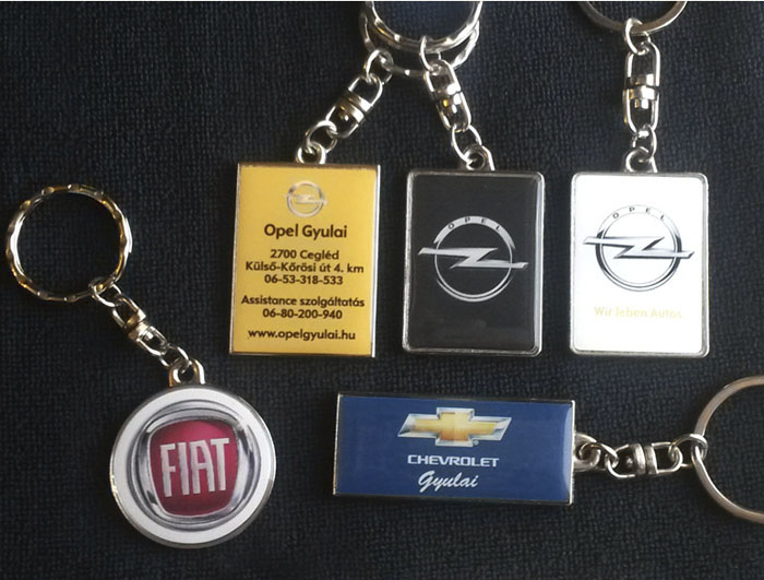 Előre gyártott kör, ovális vagy szögletes fém alapon elhelyezett 4C matrica, gyantával védve. Előnye, hogy bonyolultabb, sokszínű, színátmenetes grafika is megjeleníthető rajta. Minimális rendelési mennyiség: 200 db. Készülhet egyedi formájú gyantás kulcstartó is, könnyű fém alap nélküli változatban.